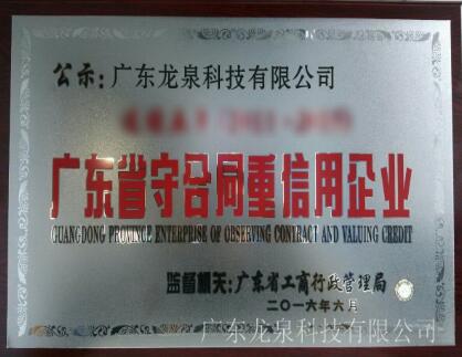 廣東龍泉科技有限公司于2016年6月中旬通過廣東省工商行政管理局公示,獲得廣東省守合同重信用企業稱號。近日,我司收到了省工商局頒發的牌匾及證書。 省工商局頒發的守合同重信用企業牌匾 我司守合同重信用...